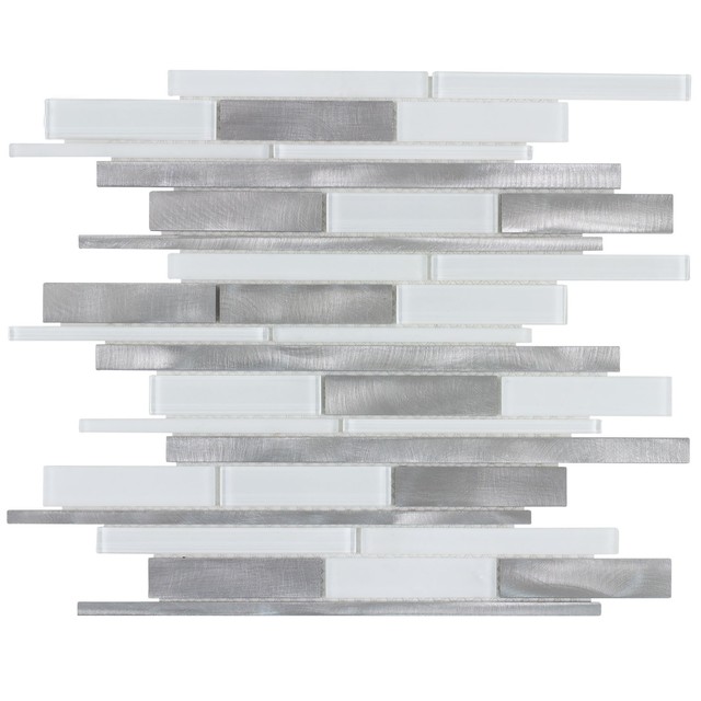 Modern Linear White Silver Multi Finish Glass Foil Metal Mosaic