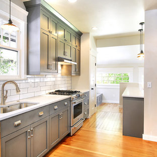 Believe it or not a classic white subway tile backsplash is capable of transforming the feel of the kitchen almost instantly. My clients were wanting a more contemporary look so we did a stacked layout. In this craftsman kitchen the vibrant green backsplash contributes a cheery accent to the shaker style cabinets and stainless steel appliances.