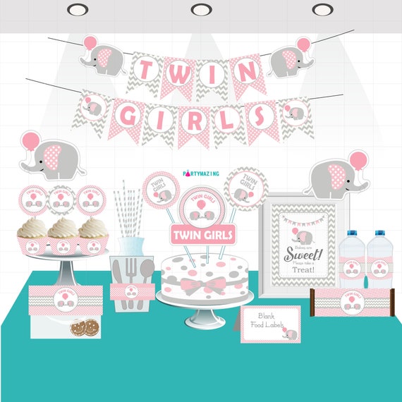 Printable Pink Elephant Twin Girls Baby Shower Express Party Set